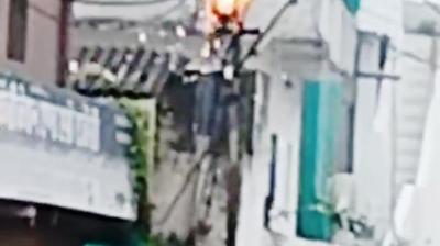 बिजली क़े खम्बे पर तारों मे लगी भीषण आग, बैंक क़े सुरक्षाकर्मी ने सीज फायर से बुझाई आग