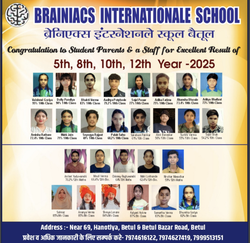 कक्षा 10 वीं में वैष्णवी गोरिया ने 95 प्रतिशत,डॉली पांडिया ने 90 प्रतिशत,भक्ति वर्मा ने 83 प्रतिशत,आदित्य पोट फोड़े ने 79.2 प्रतिशत, सेजल पवार 77 प्रतिशत, अदीबा फातिमा 75प्रतिशत,आदित्य भलावी 73 प्रतिशत,अमीषा राठौर 72.4,माही जैन 71 प्रतिशत,सुयोग्य राजपूत 69/पलक साहू 68.2 / सक्षम पात्रिकर 61/ आलोक बारस्कर 56/,सुरभि वर्मा 55/,साजिद शाह 54.2 प्रतिशत रहा l