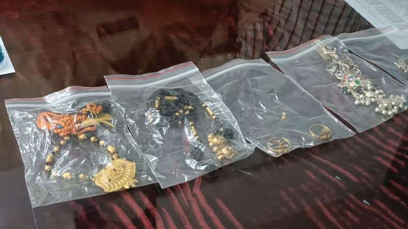 01 सोने का बड़ा हार (पैन्डल), 18 नग सोने के मोती, 02 नग सोने के मंगलसूत्र पैन्डल सहित, 22 नग छोटे बड़े मनी मोती, 02 नग सोने की कान की बाली, 01 सोने की नाक की लौंग, 02 जोड़ी चाँदी की पायल, 01 चाँदी का कमर का करधन, 03 चाँदी की अंगूठी कुल कीमती 250000/- (दो लाख पचास हजार रूपये)