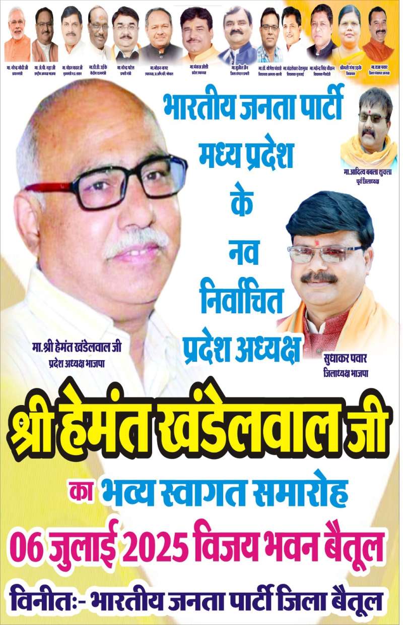 बैतूल। बैतूल के लोकप्रिय विधायक हेमंत विजय खंडेलवाल के प्रदेश अध्यक्ष के तौर पर निविरोध निर्वाचन के बाद प्रथम नगर आगमन को लेकर आम जन में उत्साह का माहौल है समाज और संगठन मिलकर अपने लाडले विधायक के प्रदेश अध्यक्ष बनने पर ऐतिहासिक स्वागत की तैयारी में जुटे हुए है। इसी कडी में आज बैतूल जिले की सीमा धार से विभिन्न समाज और संगठन स्वागत करेगें। इसी कडी में श्री खंडेलवाल जी का स्वागत भौरा बस स्टैण्ड, शाहपुर कालेज के सामने, बरेठा , पाढर , भारत भारती, सोनाघाटी, राजा भोज मार्ग, मरामझिरी जोड, अवस्थी गोदाम, थाना चौक कोठीबाजार, लल्ली चौक, बस स्टेण्ड, मुल्लाजी पेट्रोल पंप, शिवाजी चौक, एसपी आफिस चौराहा, टांगा स्टैण्ड, दिलबहार चौक, कांतिशिवा चौक, भगतसिंह चौराहा होते हुए भाजपा कार्यालय पहुंचंेगे जहां स्वागत समारोह संपन्न होगा।