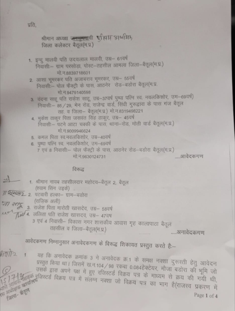 आवेदकों ने आरोप लगाया है कि नायब तहसीलदार बैतूल-2, पटवारी हल्का बडोरा सहित अन्य अनावेदकों ने मिलकर नक्शा दुरुस्ती की प्रक्रिया में कूट रचना और भ्रष्टाचार किया है। अनावेदक राजेश ने तहसील कार्यालय में खसरा नंबर 104/98, रकबा 0.084 हेक्टेयर, मौजा बडोरा की भूमि का नक्शा दुरुस्त करवाने आवेदन प्रस्तुत किया था। यह भूमि उसने विक्रय पत्र के आधार पर खरीदी थी, परंतु आवेदन में केवल छायाप्रति संलग्न थी, खसरा किश्तबंदी जैसी जरूरी जानकारी नहीं दी गई थी।
