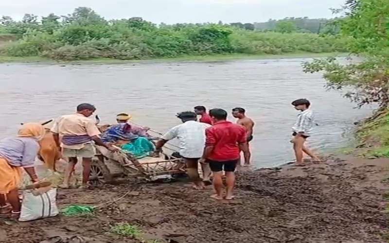 उफनती नदी में बैलगाड़ी बनी एकमात्र सहारा