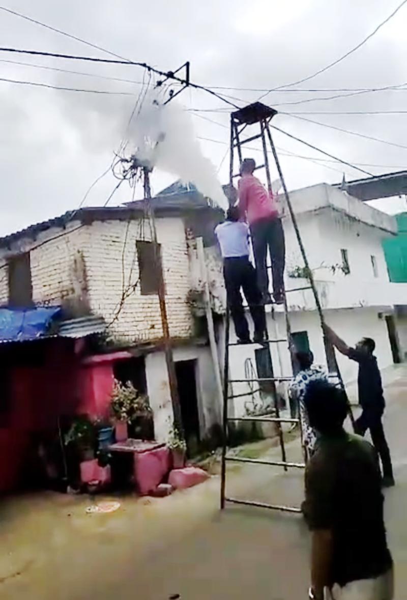 बिजली क़े खम्बे पर तारों मे लगी भीषण आग, बैंक क़े सुरक्षाकर्मी ने सीज फायर से बुझाई आग