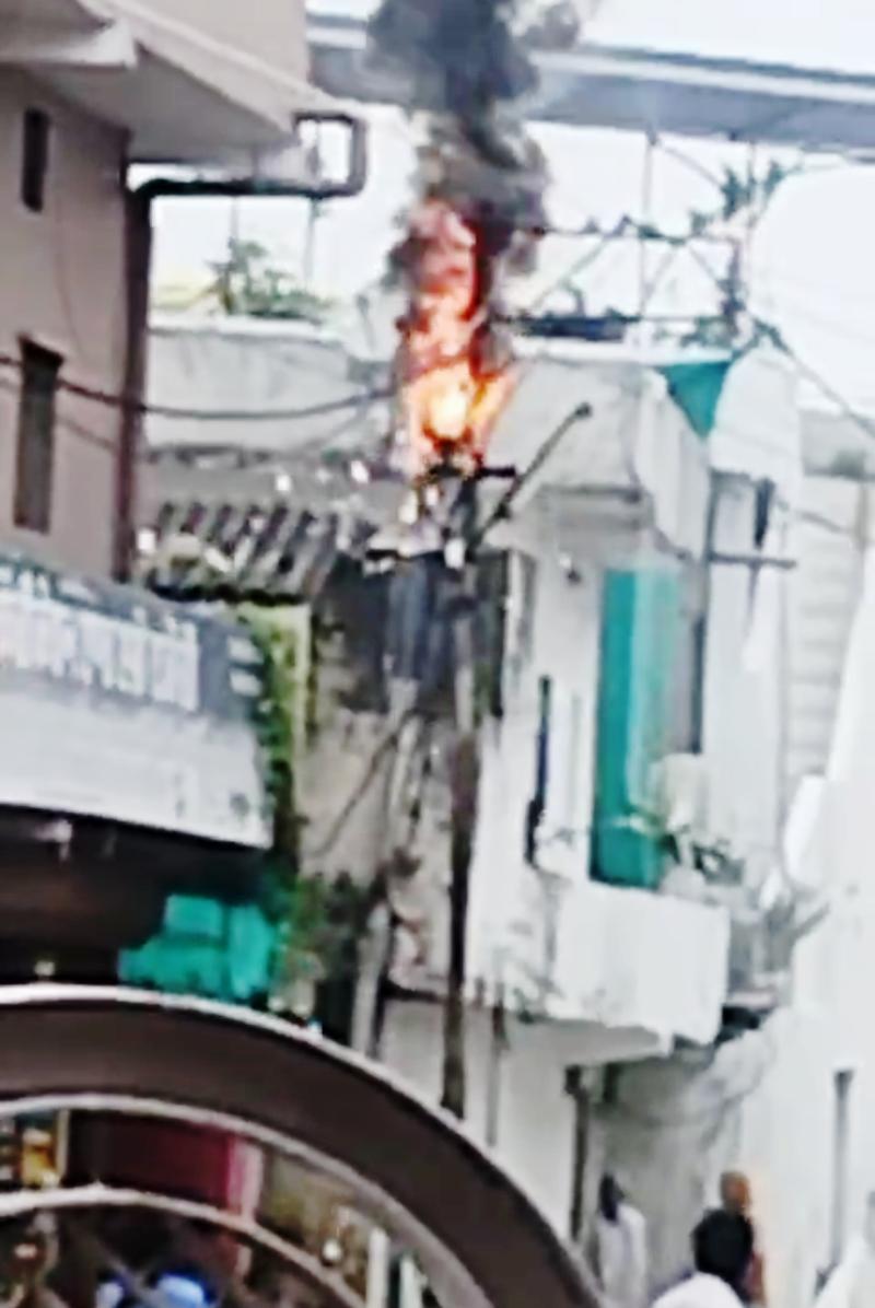 बिजली क़े खम्बे क़े ऊपर सर्किट बॉक्स मे भीषण आग लग गई आग लगने से केबल तार धुं धुं कर जलने लगे और शार्ट सर्किट की वज़ह से तेज आवाज़ आ रही थी l