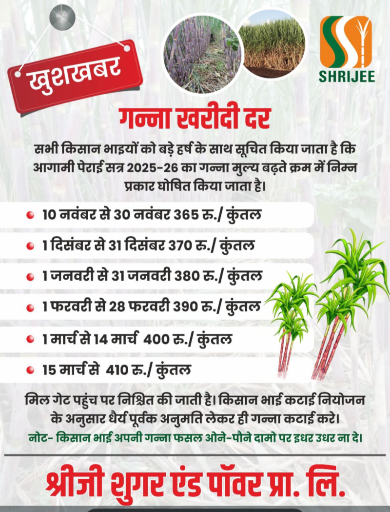 श्रीजी शुगर एंड पावर ने घोषित किए गन्ना खरीदी दर, 365 रुपये प्रति क्विंटल पर होगी शुरुआत