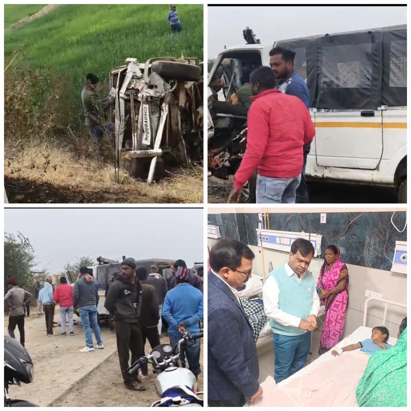 बैतूल जिले मे एक स्कूल वेन और तूफान वाहन की हुई टक्कर, एक बच्ची किहुई मौत, एक दर्जन बच्चे हुए घायल, कलेक्टर ने अस्पताल पंहुचकर घायलों के जाने हाल, बेहतर इलाज के दिए निर्देश