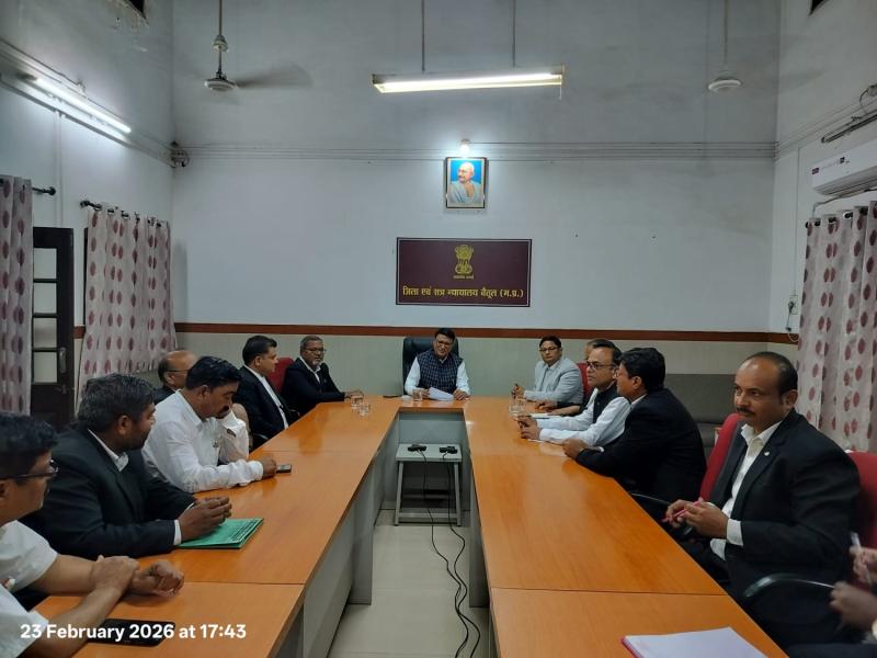 14 मार्च 2026 को आयोजित होने वाली नेशनल लोक अदालत में मोटर दुर्घटना एवं क्षतिपूर्ति दावा के अधिक से अधिक प्रकरणों में समझौता कराने के उद्देश्य से प्रधान जिला एवं सत्र न्यायाधीश, अध्यक्ष जिला विधिक सेवा प्राधिकरण बैतूल दिनेश चन्द्र थपलियाल द्वारा 23 फरवरी को बीमा कंपनी के अधिकारी, पैनल अधिवक्ता तथा क्लेमेंट के अधिवक्तागणों की बैठक ली गई।