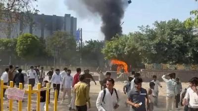 श्रमिकों का उग्र प्रदर्शन, नोएडा में हिंसा—5 वाहन जलाए, दिल्ली पुलिस हाई अलर्ट पर
