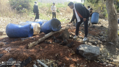 पुलिस ने कच्ची शराब बनाने के ठिकानों पर दबिश देकर लगभग 4 लाख रूपए मूल्य का महुआ लहान किया नष्ट